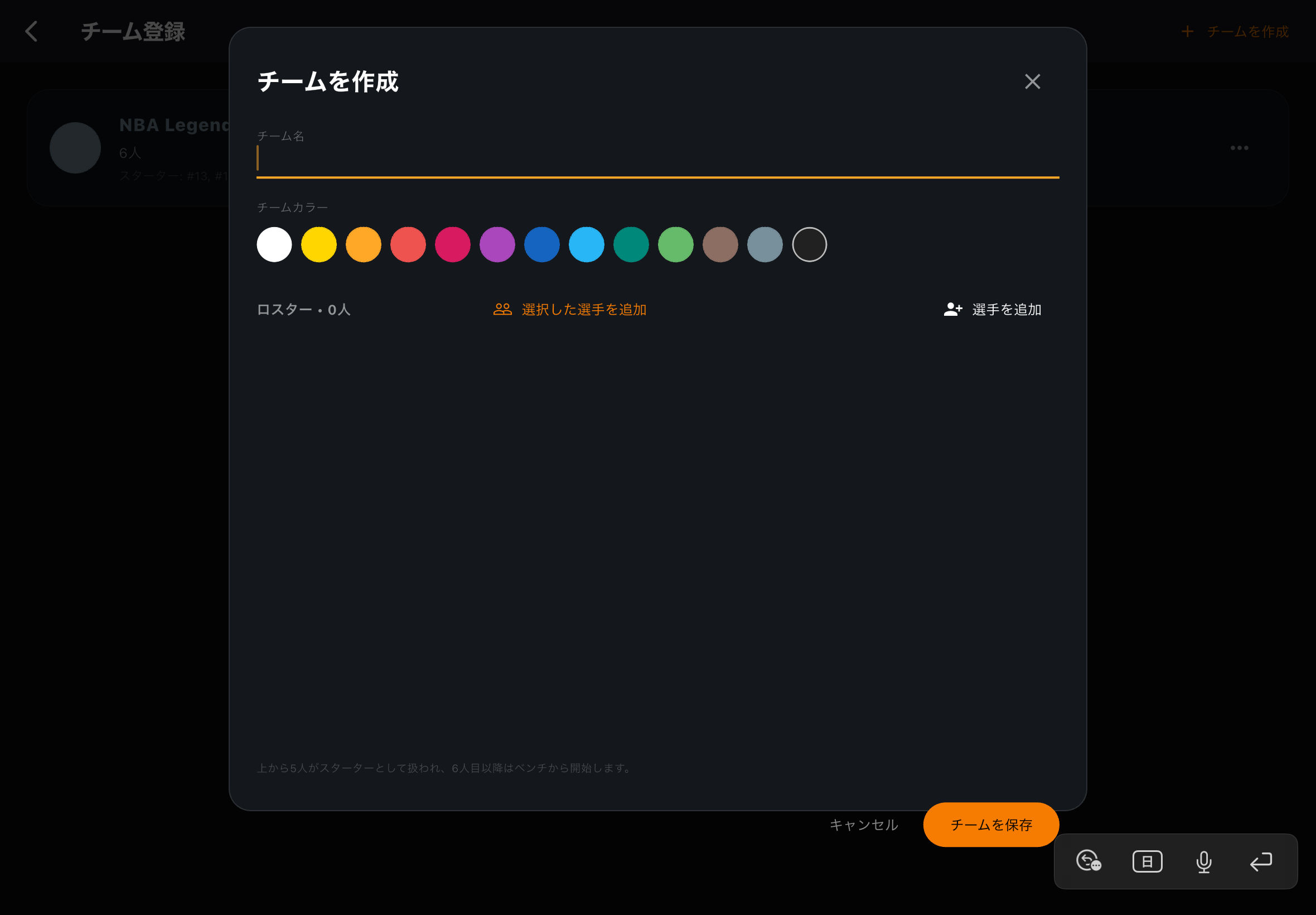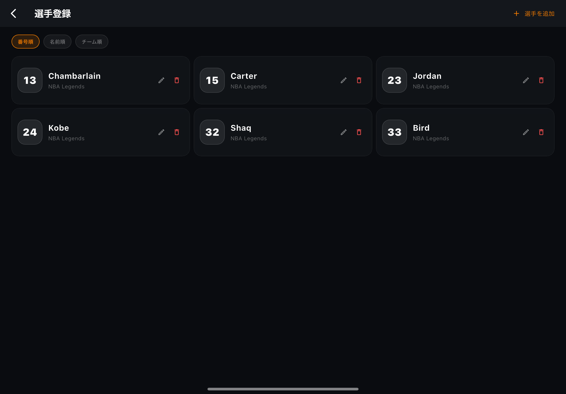 NBA風ボックススコアが自動生成。試合を重ねるたびにキャリアスタッツが積み上がり、感覚ではなく数字で選手の成長を確認できる。