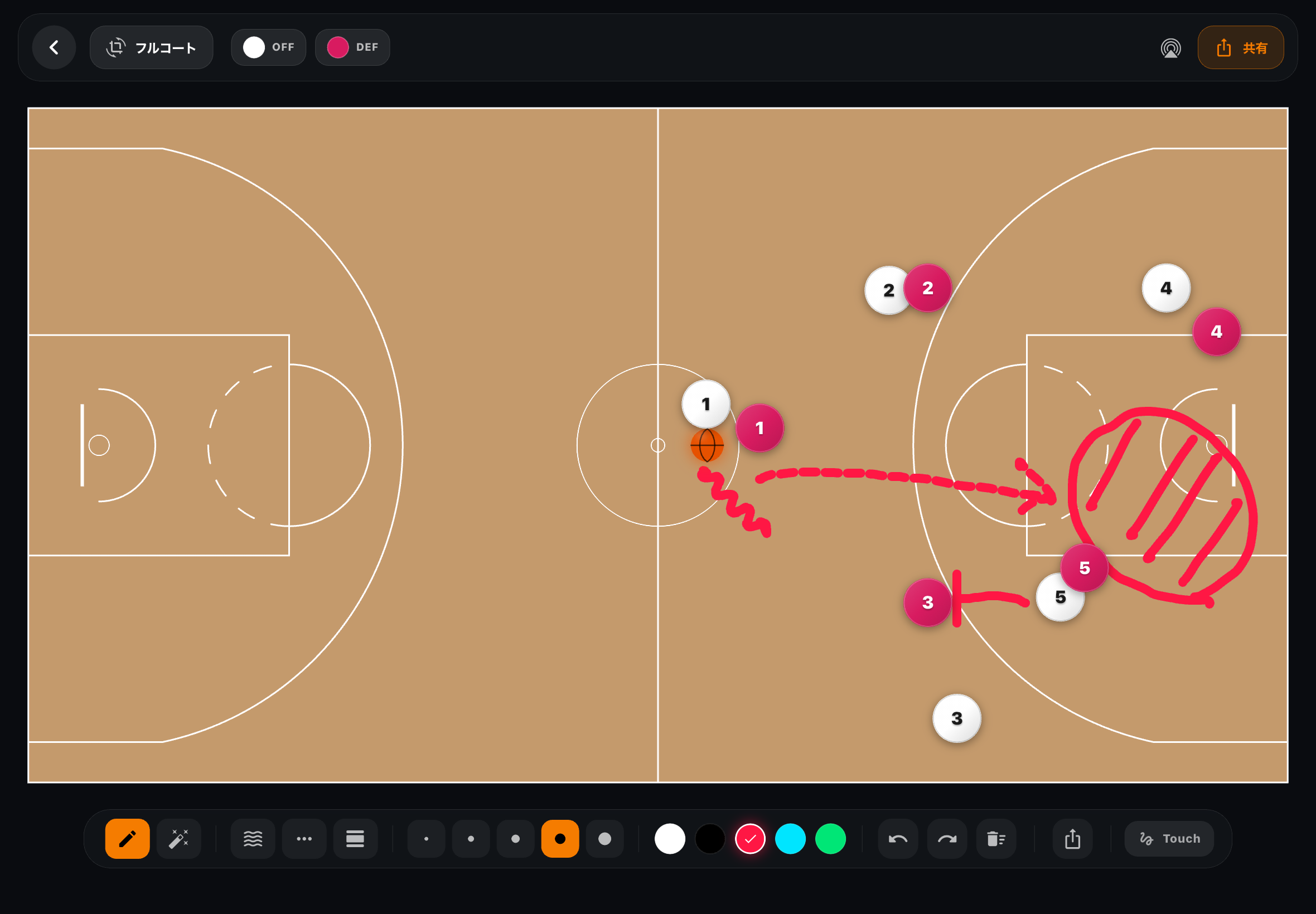 フルコートの速攻もハーフコートのセットプレイも、ワンタップで切り替え。アニメーション機能でフレームごとに動きを記録すれば、「タイミング」と「連動」をチーム全員で共有できる。
