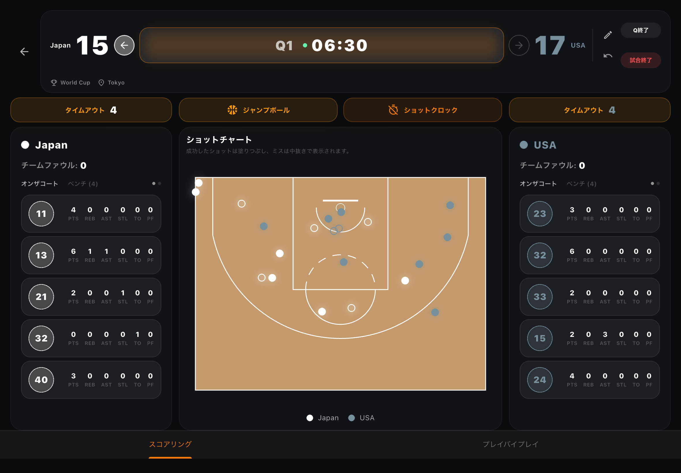 タイムアウト30秒で作戦を描き、ワンタップでスコア記録。試合の流れを止めない設計。