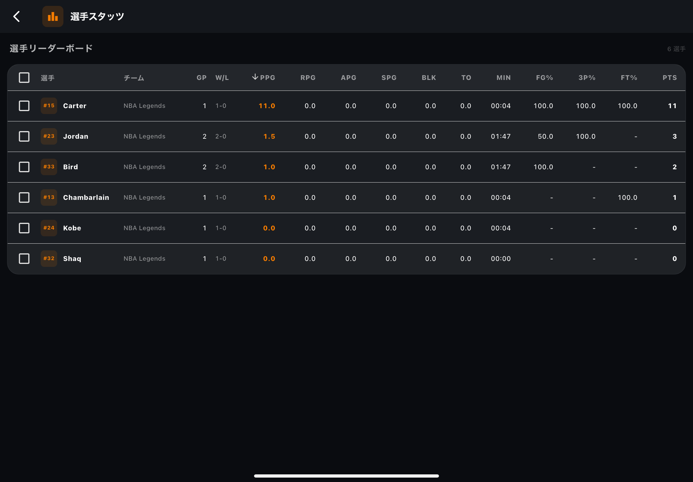 NBA風ボックススコアが自動生成。試合を重ねるたびにキャリアスタッツが積み上がり、感覚ではなく数字で選手の成長を確認できる。